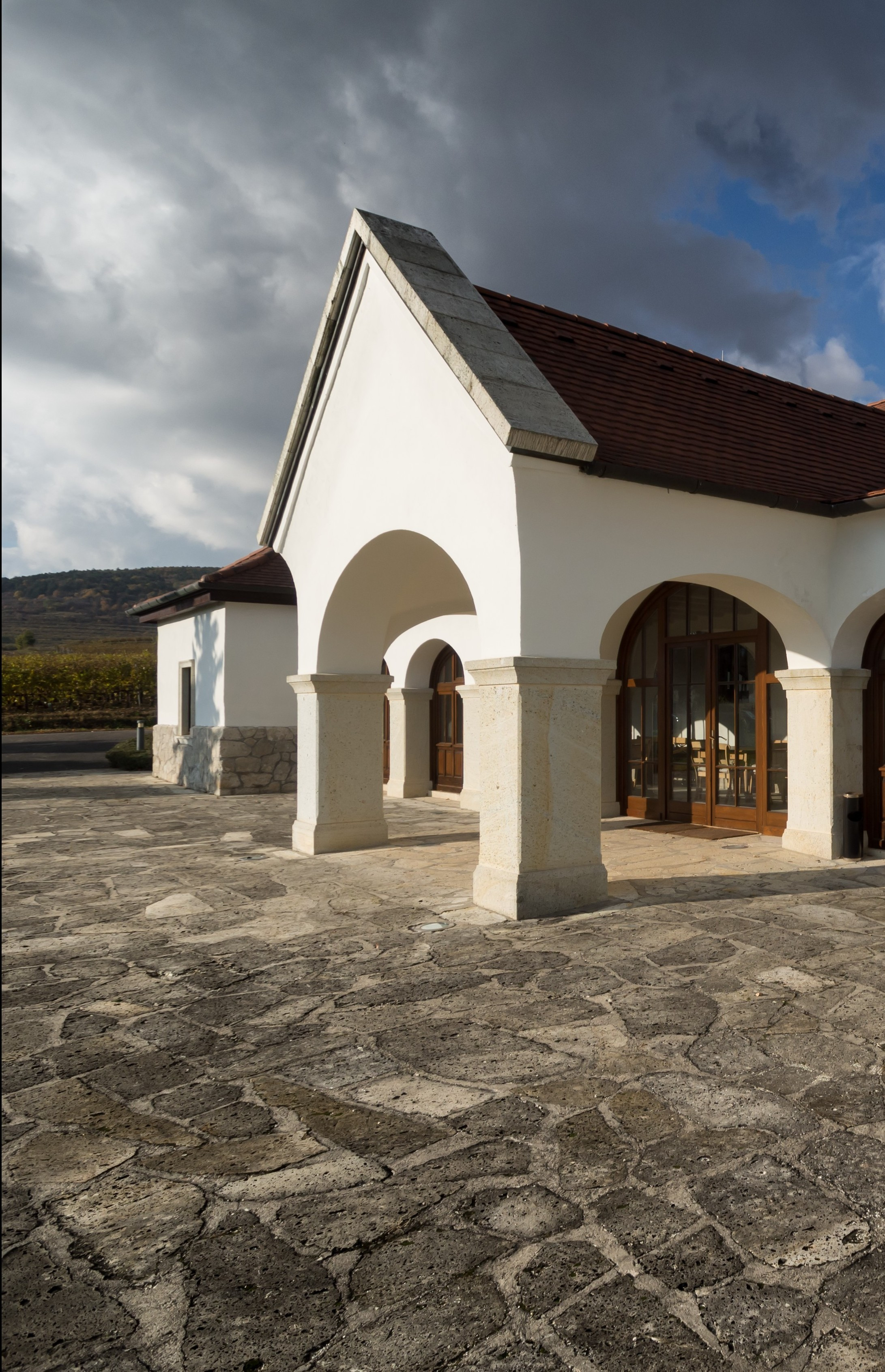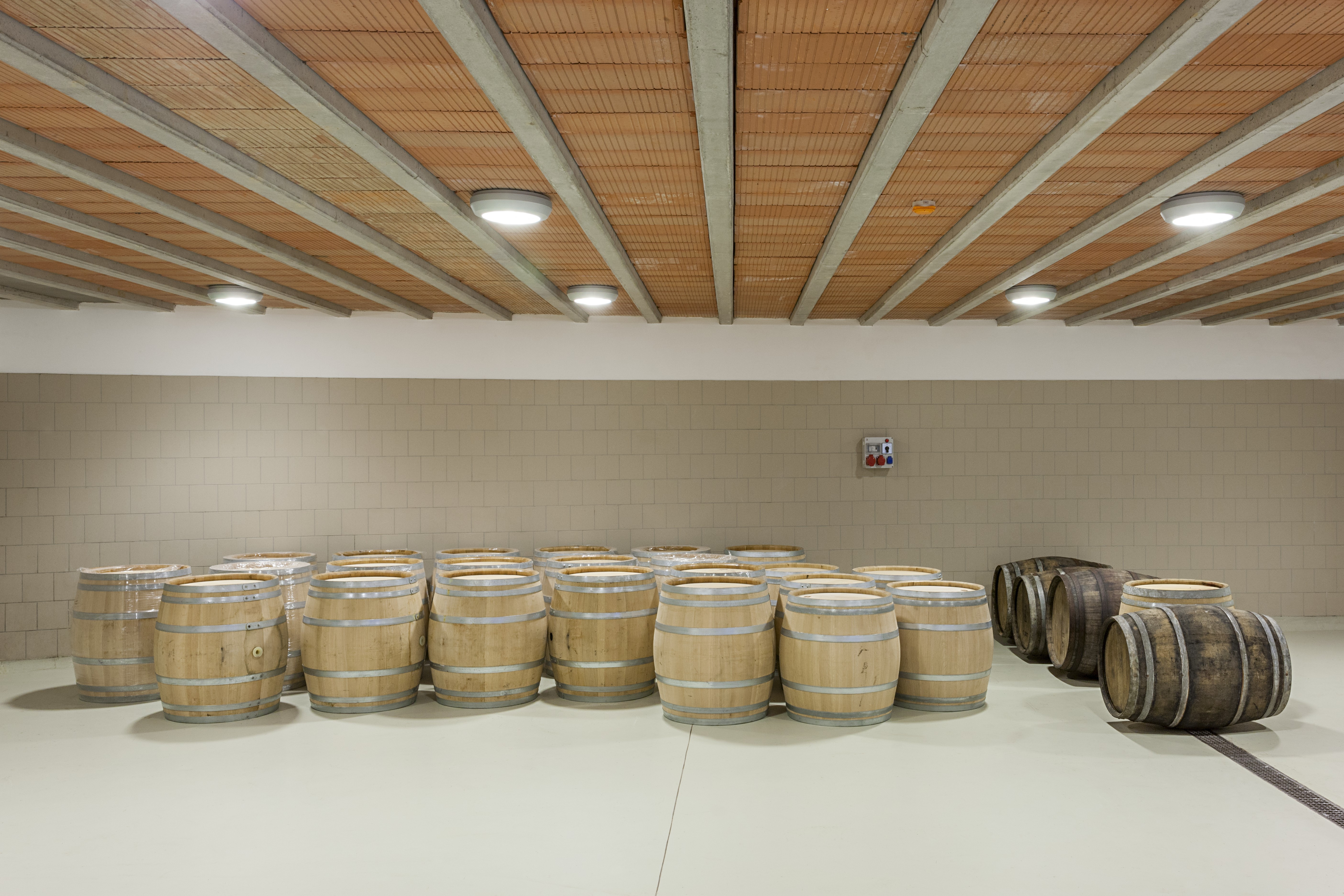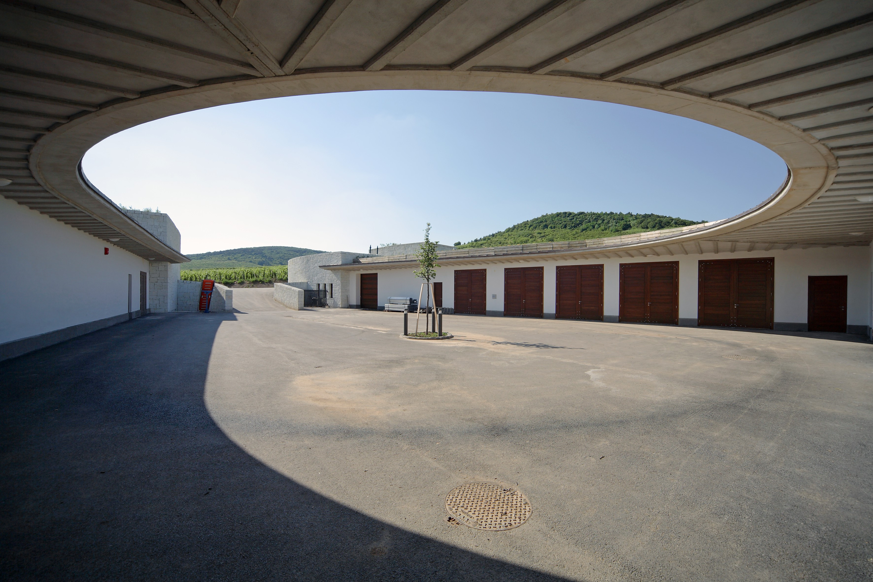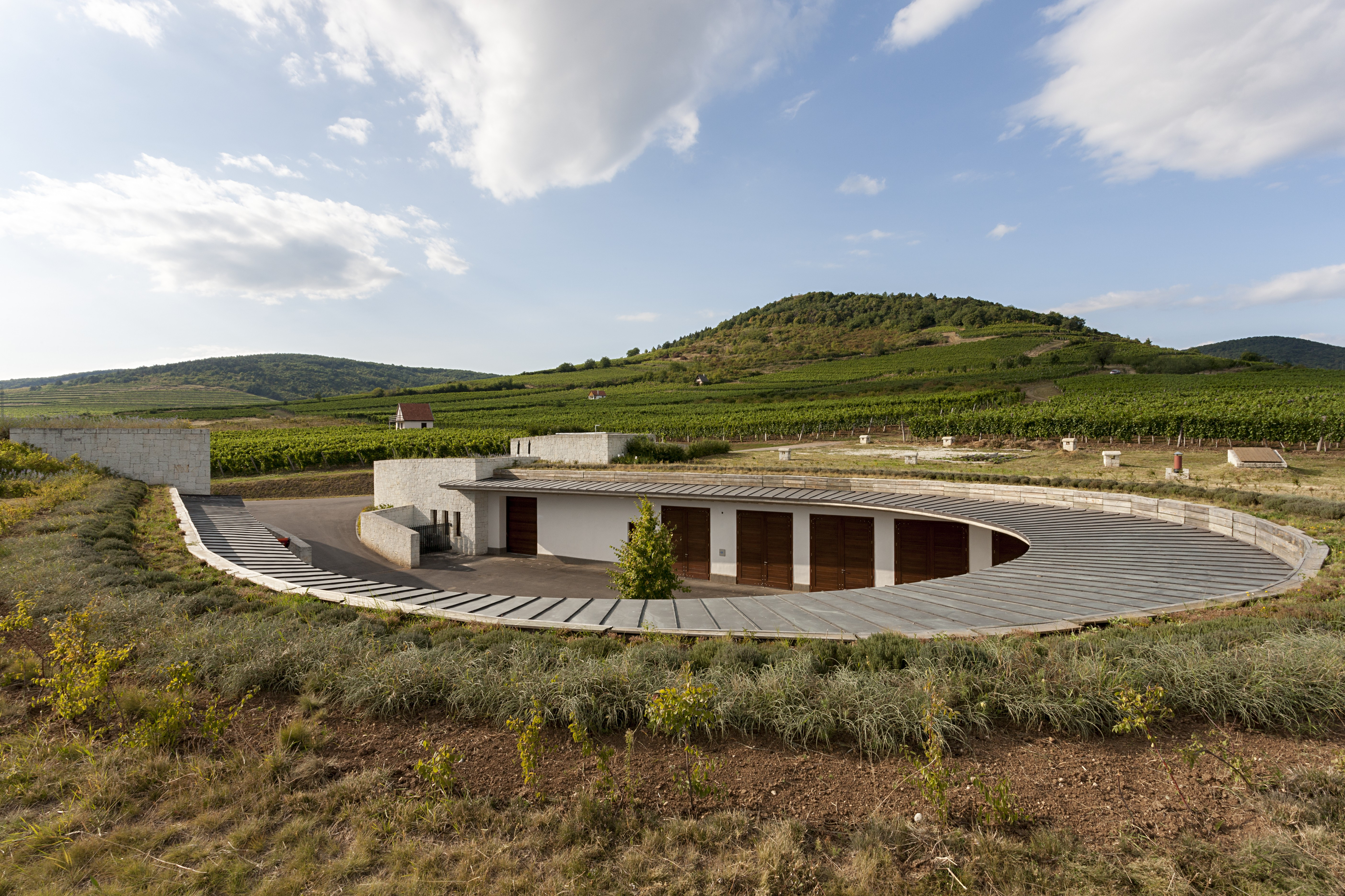 A borászat üzemi épülete nem kíván konkurálni a borházzal, avval ellentétben nem épületként jelenik meg, hanem a szőlőhegyek támfalait, kőbástyáit, katlanjait megidéző terepalakulat mögé rejtőzik.