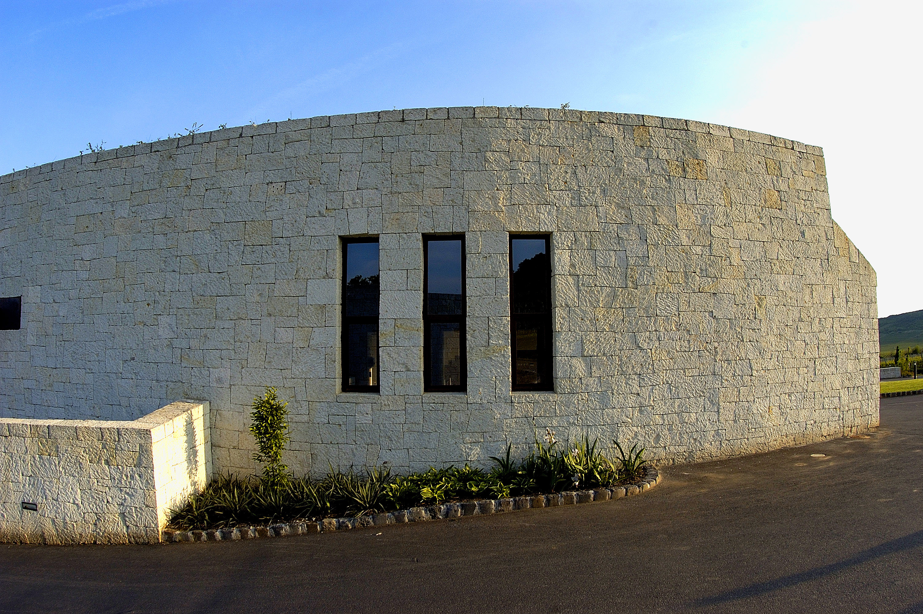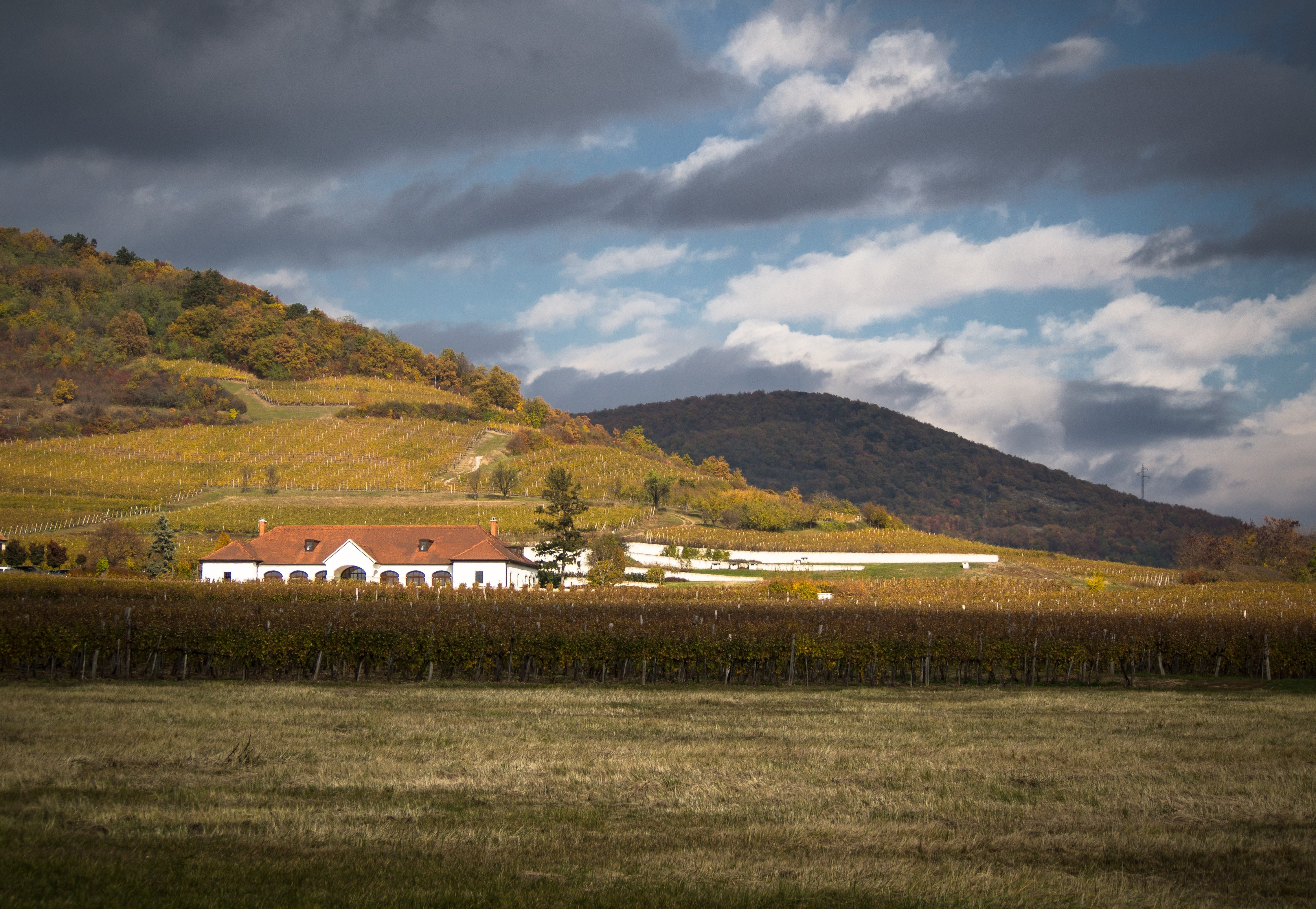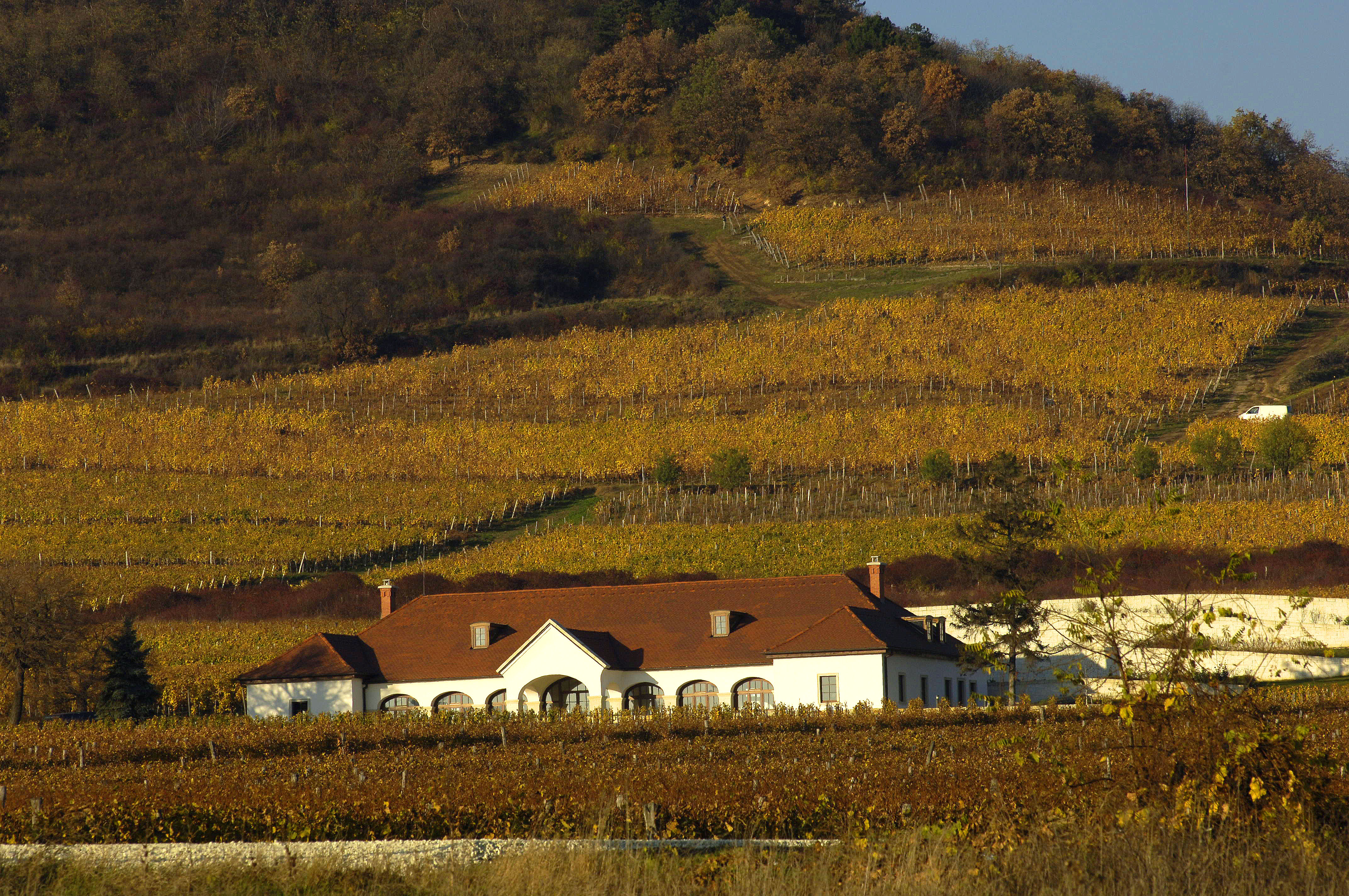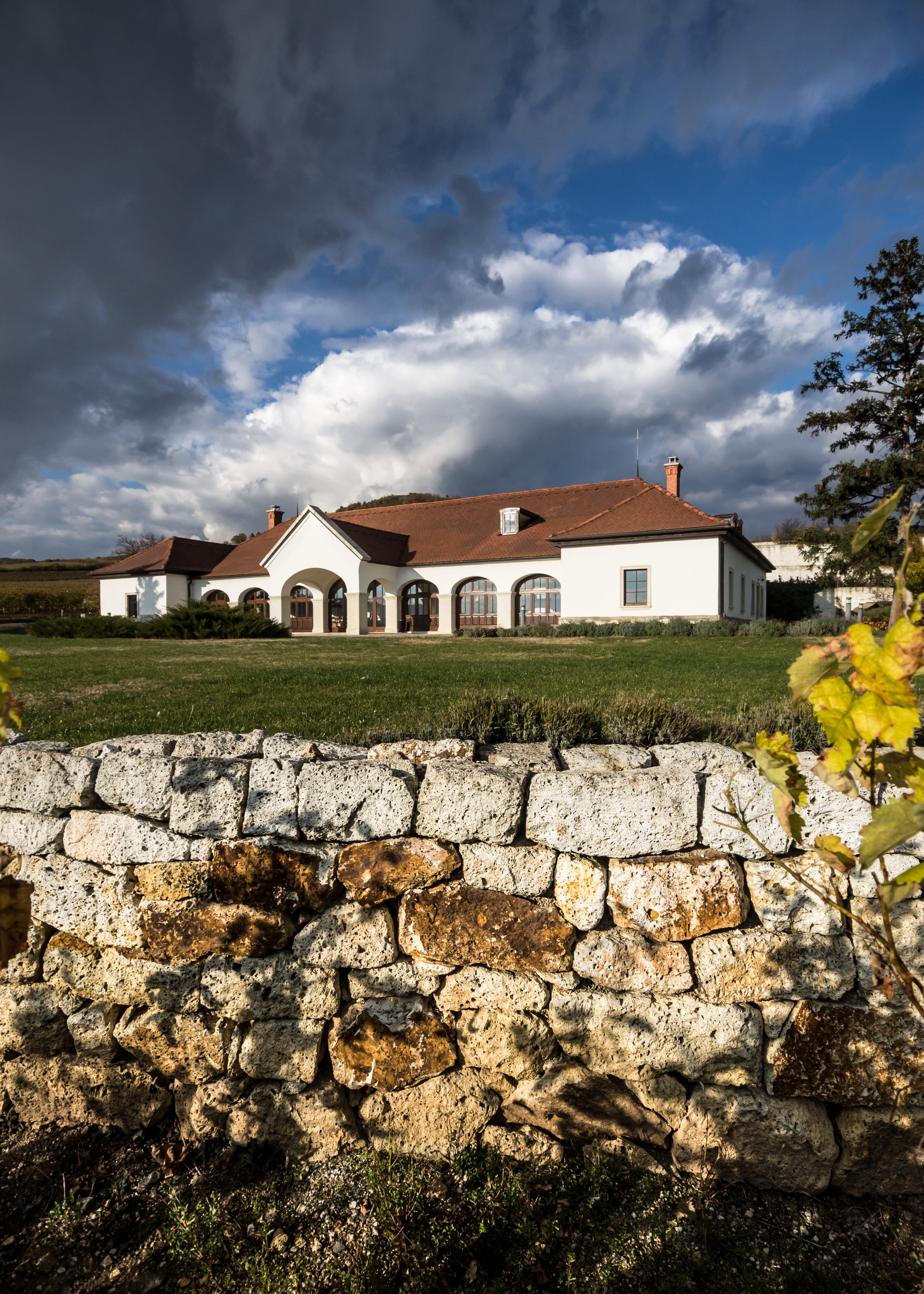A borászat üzemi épülete nem kíván konkurálni a borházzal, avval ellentétben nem épületként jelenik meg, hanem a szőlőhegyek támfalait, kőbástyáit, katlanjait megidéző terepalakulat mögé rejtőzik.