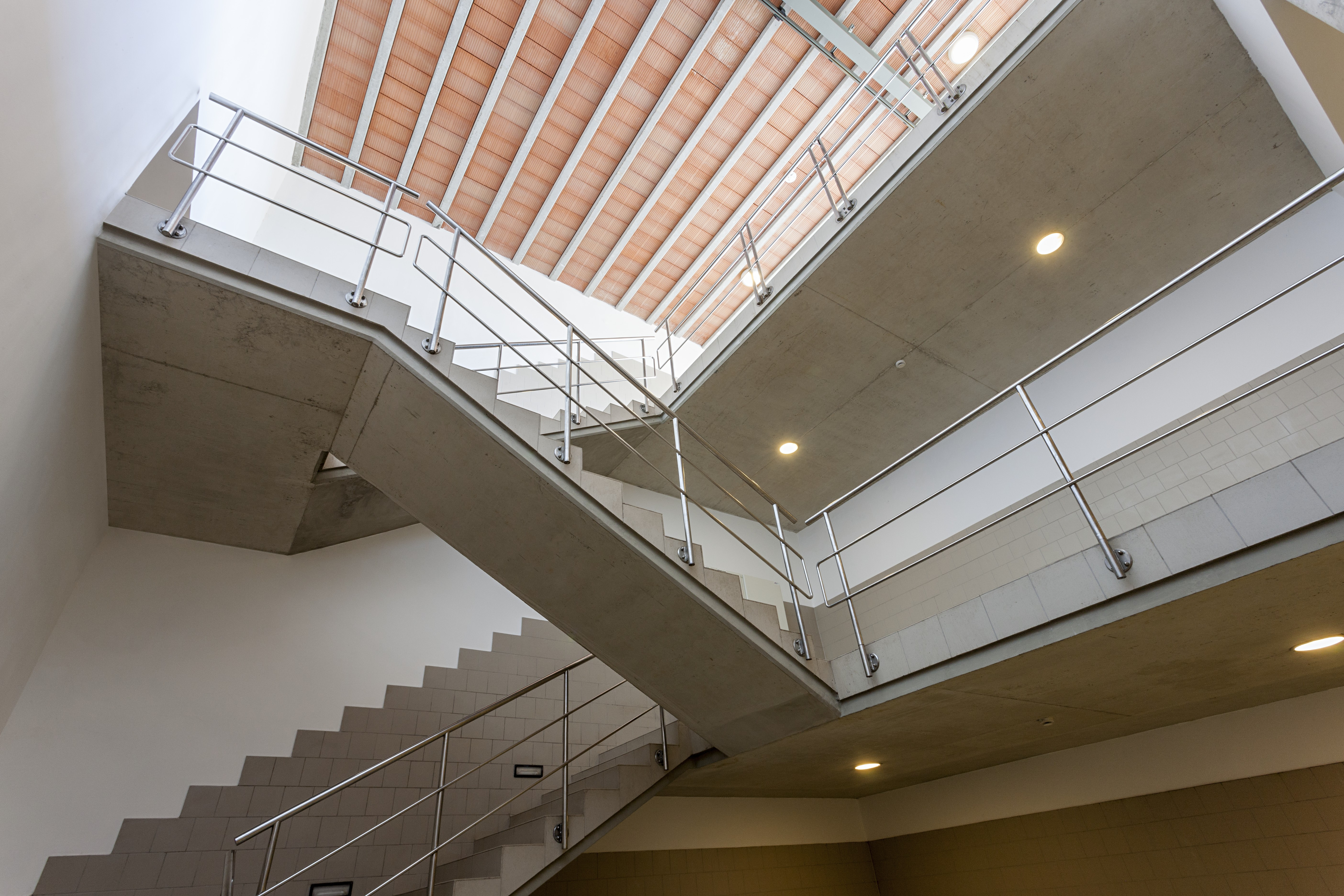 A zöld dombok és rézsűk alatt, a terméskő támfalak mögött egy lesüllyesztett udvar köré szervezve helyezkednek el az üzemi terület helyiségei.
